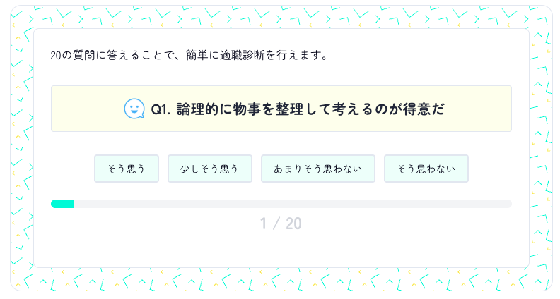 20問質問に答えることで、適職診断が受けられます。